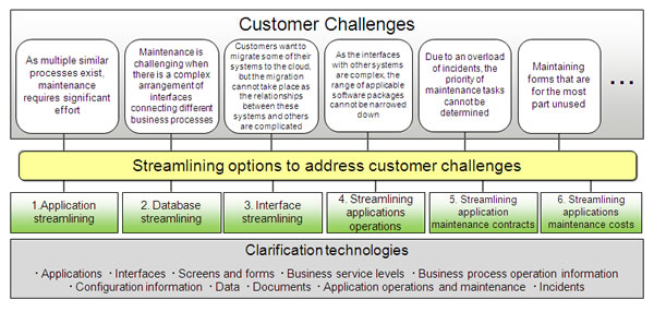 To address these kinds of challenges, Fujitsu is delivering a new service for streamlining customers' existing systems that is based on the know-how acquired by Fujitsu in the implementation of its own internal systems as part of its APM Modernization Services for Cloud.