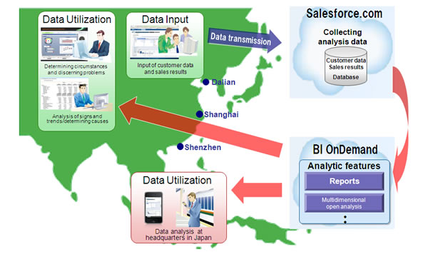 Fujitsu put together the optimum service combination, and was able to build this system in a short period of time. Utilizing Salesforce.com's Force.com cloud platform, the system collects and shares customer information, sales figures, and other kinds of numeric data in a cloud environment. This improves business efficiency in the company's sales activities and offers more expeditious customer support. Speeding development of the system was the use of Salesforce.com's service, which supports multiple languages. Furthermore, the system leverages the SAP® BusinessObjects™ BI OnDemand cloud-based data analytics tool, which, in turn, enables richly expressive data records.