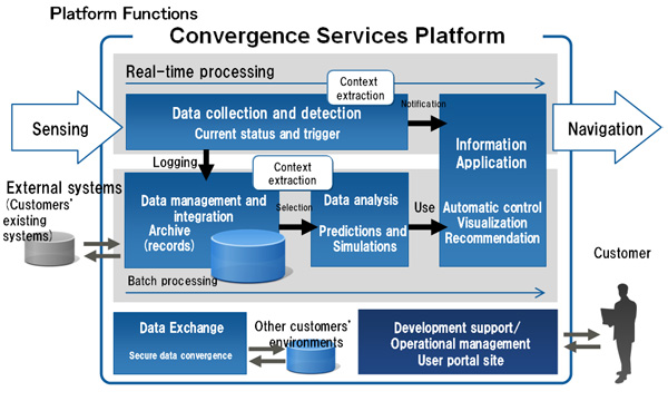 Fujitsu has been developing its Convergence Services Platform that is essential for making convergence services a reality. It is an integrated platform that can accumulate and analyze big data, process it in real time, and perform contextual processing of data(1). Fujitsu plans to be the first in the world to offer this type of Convergence Services Platform as a PaaS platform.