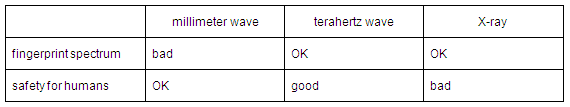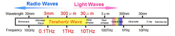 Terahertz waves have a wavelength of approximately 0.3 mm, lying on the spectrum of electromagnetic radiation between light waves and radio waves, and can penetrate non-metallic substances such as paper, plastic, and textiles. Similar to how objects look different under X-rays and visible light, the use of terahertz waves reveals objects in a different way. A specific item can be identified by its characteristic spectrum (a "fingerprint spectrum") under terahertz waves. As well, compared to X-rays, terahertz waves are deemed safe for people. On the other hand, as terahertz-wave imaging has far been a time-consuming process, it has had a limited range of applications. However by taking advantage of the ability to make visible what had been invisible, the use of terahertz waves holds promise in applications that make the inside of objects visible. This includes customs inspections without the need to open luggage or packages, inspections of the contents of envelopes, inspections of adulterants in foodstuffs, and quality inspections of electronic devices.