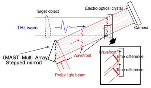 To measure the object without moving it, Fujitsu Laboratories developed an improvement to the technique using a terahertz wave and angled probe light beam in which a newly-developed graduated mirror array with multiple levels is placed in the light beam. As this technique produces results equivalent to those obtained when taking multiple exposures with incremental movements between each, it becomes possible to perform an inspection with just one exposure.