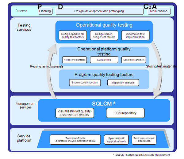 In this service, test results are organized and made visible. A risk evaluation of the system is then conducted, along with an analysis and evaluation of the quality status. This includes a service menu of a lifecycle-management repository for storing and managing analytic information and test materials, as well as quality analysis (visualization of results). This makes system-quality test results accessible not only to the IT department but also to management. The service can also analyze the impact that operational reforms have on systems, enabling system quality lifecycle management, in which system quality is continuously improved.