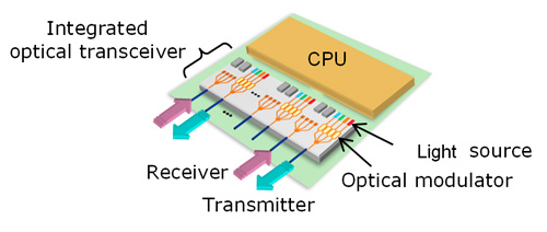 Much effort has been devoted to research and development on optical transceivers, which use silicon photonics technology as a step toward implementing large-capacity optical interconnects between CPUs. The use of silicon photonics technology allows for the optical transceivers to be miniaturized and therefore, to be densely integrated near CPUs. Also, because they use silicon semiconductor manufacturing technologies, it should be possible to produce them in large volumes and at low costs.
