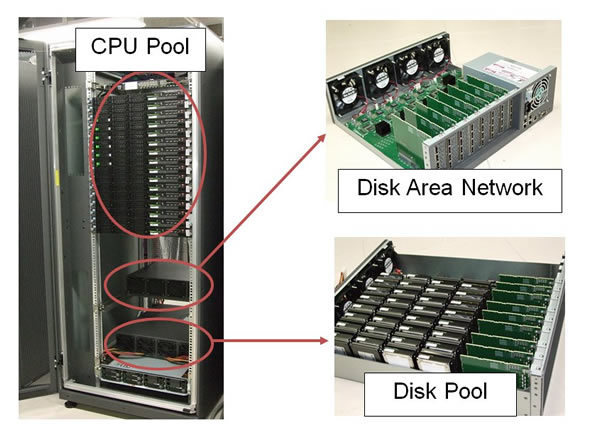 The disk pool comprised of multiple HDDs is connected to the CPU pool via a high-speed interconnect disk area network. The HDDs linked to the CPUs through the disk area network have the same disk access capabilities as the local disks in a typical server, and their performance is not affected by other CPUs. A disk area network was created using prototype interconnects that connect a CPU to a given HDD at a speed of 6 Gbps without any mutual interference.