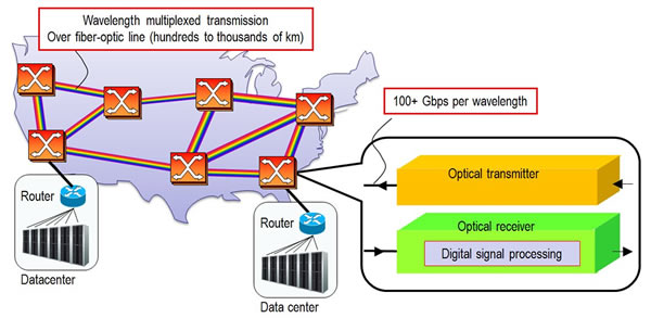 As the volume of data transmitted over the internet grows with the widespread use of smartphones and the development of cloud services, the trunk-line networks operated by telecom carriers and the networks that tie together large-scale datacenters are being called upon to carry more bandwidth at lower cost and greater efficiency. Wavelength division multiplexed (WDM) fiber-optic transmission systems that can carry 100 Gbps per wavelength—more than ten times existing levels—are expected to go into volume commercial deployment around 2012, and R&D efforts are progressing to enable continuous capacity increases in the future.