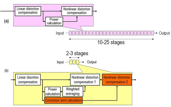 The Fujitsu team has now developed a new signal-processing algorithm that, while retaining the distortion-correction performance of the technology developed last year, slashes the number of stages(5) required in a distortion-compensation processing circuit to about one-seventh current typical levels (and about half the level of Fujitsu's previous technology). Key features of this technology are as follows.