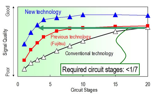 Figure 3. Relationship between signal quality and number of circuit stages for conventional technology (white triangles), Fujitsu's September 2010 technology (red squares), and the technology announced today (blue triangles).