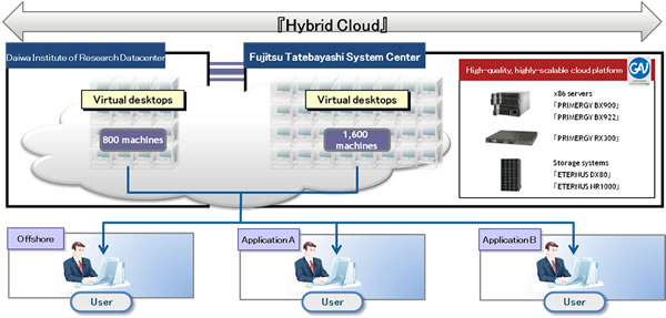 With Fujitsu having built a platform that conforms to the Alliance Cloud at its Tatebayashi System Center, Daiwa Institute of Research then built a cloud platform with the identical specification(2) in its own datacenter and connected the two platforms through a network, enabling the operation of a hybrid cloud. Going forward, Daiwa Institute of Research plans to use the two platforms for a variety of applications, such as a virtual desktop environment, to promote greater ICT resource efficiencies and optimization, minimize total cost of operations, and implement business continuity measures.