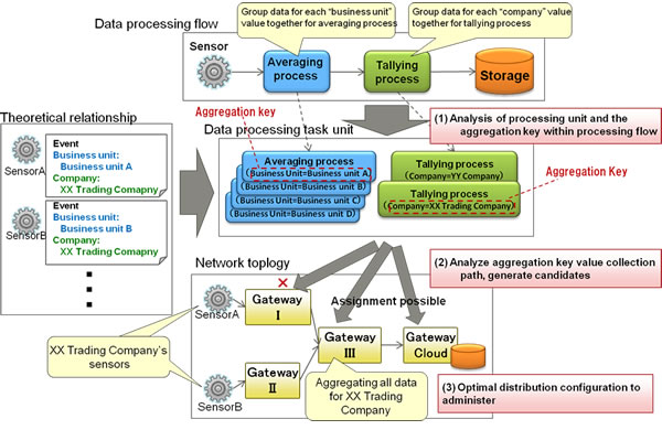 Averaging, tallying and other processing tasks that comprise the data processing flow are performed on aggregate data from multiple sensors. Therefore, the effective way of reducing communications traffic volumes is to perform the processing at the point where the data from these sensors is physically gathered together in one place. On the other hand, in such processing tasks as averaging or tallying, there are many cases in which the processing involves data that are theoretically aggregated, such as averages for each business unit or for the company as a whole. In such cases, in order to determine the assigned gateways, it is necessary to take into account not just the sensor data itself but also the theoretical meanings of the sensor data. Accordingly, Fujitsu Laboratories developed an aggregation key for grouping data for each form of processing, such as "by business unit" or "by company." It also developed a method for identifying the groups of sensors for each data processing task unit, based on the theoretical relationship between each sensor and such values as "business unit" or "company," and for efficiently identifying the optimal gateway for performing each data processing task unit.