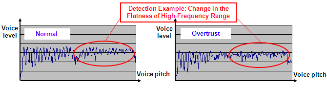 Nagoya University and Fujitsu created a function that, by detecting changes in voice pitch and level, as shown in figure 1, is able to infer situations of overtrust on the part of the intended victim when overwhelmed by distressing information from the suspected perpetrator.