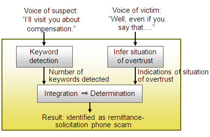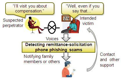 In cases of remittance-solicitation phone phishing scams, the suspected perpetrator will often pretend to be an acquaintance of the victim or a person in a position of authority, such as a police officer or lawyer. They will then convey distressing information, such as relating to a scandal or crime supposedly committed by an acquaintance of the intended victim. Nagoya University and Fujitsu developed a function using word spotting voice recognition technology to identify when the suspected perpetrator uses special keywords from a pre-registered list, such as "indebtedness" or "compensation." The function using word spotting voice recognition technology, which ignores everything except the keywords on the pre-registered list, detects the number of times keywords relating to remittance-solicitation scams are spoken.