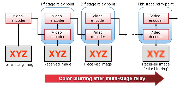 In general, images can be separated into brightness components and color components. It is also widely known that the human visual system has a lower ability to discern the resolution of color components compared to brightness components. Consequently, when transmitting video at a low rate, the video transmission process usually involves using H.264/AVC(2) and other video encoding technology to shrink by half the horizontal resolution of only the video's color components with a video encoder. Technology has been widely used to then expand the resolution of the color components to their original resolution using a video decoder, and then re-render the video together with the brightness components before playing. Between the video input and output stages, however, the color components of the video after transmission become slightly degraded due to the process of shrinking and expansion. After a single video transmission, the degradation of the color components is extremely minor and has relatively no effect on video quality. But after multiple stages of video relay to multiple relay points, the color component degradation accumulates, ultimately resulting in visible color degradation (Figure 3).