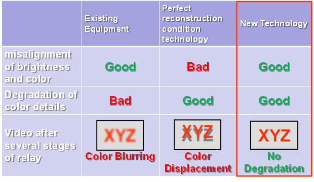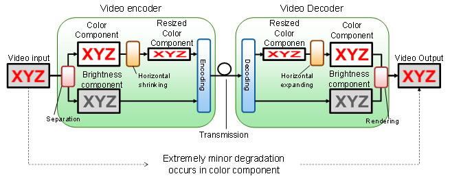 Designing the new technology with an emphasis on compatibility with existing equipment makes it possible for companies to gradually adopt the new technology. Degradation resulting from the halving and doubling of video color components falls roughly into two categories: 1. Color blurring resulting from the degradation of color details; and 2. Color displacement resulting from the misalignment of an image's brightness and color components. Color component shrinking and expansion used in existing video encoder devices are often plagued by color blurring. Although research has been done on the "perfect reconstruction condition" in which images can be shrinked and expanded without degradation, it has been impossible to commercialize such technology because of the unavoidable color displacement that occurs when connecting it to existing video encoders.