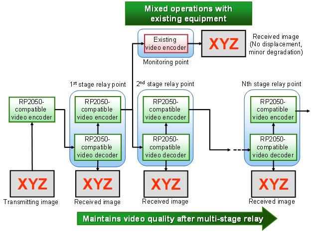 By equipping video encoders with the new color degradation minimizing technology, which was adopted as a SMPTE Recommended Practice RP 2050-1:2012, it is possible to inexpensively build a high-definition video transmission system that minimizes color blurring, even after repeated video relays (Figure 5). Increased adoption of the technology going forward enables general viewers to enjoy even higher quality video.