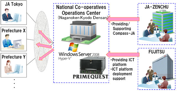 In recent years, the JA Group nationwide has faced a variety of challenges, such as an aging population, a lack of new farmers and difficulties in operating and maintaining ICT systems. As such, there is a pressing need for ways to reduce the total operating costs of ICT environments. As one way to address this need, the JA Group's governing body, JA-ZENCHU, began exploring the possibility of constructing the Center inside one of the JA Group's existing information centers. The purpose of the new center would be to deliver a variety of business systems, including Compass-JA, which is already in use by the JA Group, as cloud services.