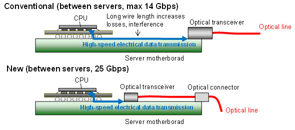 Advances in CPU processing power have greatly increased the data-processing capabilities of servers. Now, with improved virtualization technology which allows a single CPU to run multiple processes, the volume of data passing among CPUs and between CPUs and peripherals is vastly increasing. While today's servers use optical interconnects capable of data rates of 10 Gbps per channel, expectations for future servers are that they will be able to run even faster, at 25 Gbps. Furthermore, as Figure 1 illustrates, it is also hoped that optical interconnects can be used not only for data communications among servers, but also among boards within a server, as higher data rates become difficult to achieve with electrical communications.