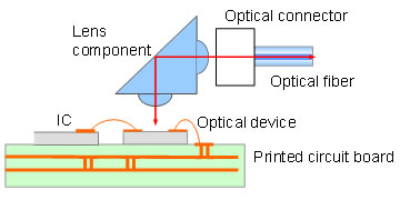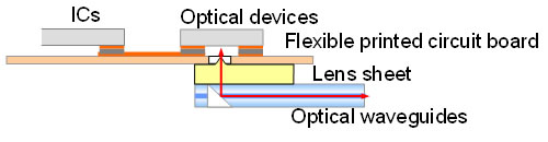 Conventionally, efficiently transmitting optical signals between opto-electric converters and optical fiber (optical coupling) required an optical coupling unit that consisted of a lens component and an optical connector (Figure 3). However, the size of the lens component was large and the cost was high. This new construction consists of an opto-electric converter with a flexible printed circuit board that has been equipped with optical devices and ICs, allowing for a compact optical transceiver. In addition, Fujitsu Laboratories has also developed a cost-effective film-type lens sheet which is stacked on the underside of the flexible printed circuit board, thereby solving the problems mentioned above.