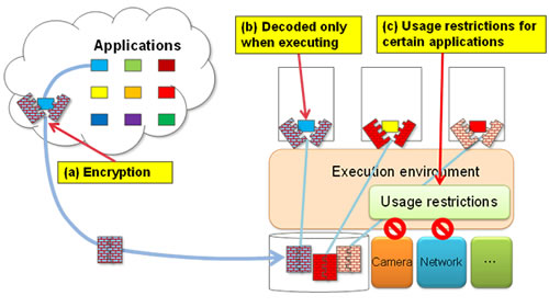 Fujitsu Laboratories also developed secure execution environment technology that enables applications to be securely executed and imposes usage restrictions on, for example, the smartphone's built-in camera or network access (see figure 3). The applications and data are encrypted in advance and delivered to the smartphone. The encrypted data is kept as it is on the smartphone and the decryption is carried it out on the fly. As a result, the decrypted data will not be stored anywhere except in the execution memory. In addition, if necessary, usage restrictions can be imposed on the smartphone's camera or the network, enabling unnecessary operations to be prevented. For example, even if there was malware embedded in an application that was able to read data stored in a memory card and upload it onto a website, this action would be prevented if the smartphone was managed in advance to only be able to access designated websites.