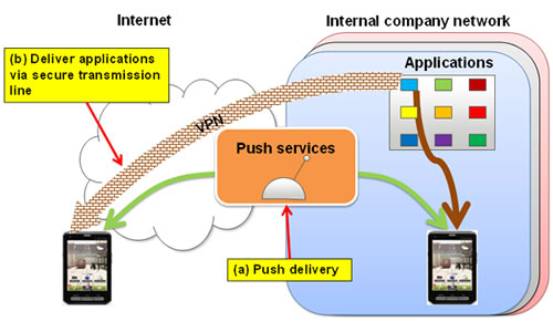 Fujitsu Laboratories also developed seamless push technology that enables the seamless delivery of applications to smartphones, regardless of whether it is through the company's own network or an external network (see figure 4). For example, if the owner of the smartphone is outside of the company, a notification will be sent requesting that the smartphone first establish a connection with a secure virtual private network (VPN). This is done over a public mobile network, from the cloud to the smartphone. Having received the notification, the smartphone connects with the cloud and the VPN, establishing a secure transmission line, thus allowing company data to be received safely. Rather than restricting the delivery of applications only to smartphones connected to the company's own internal network, this also enables the delivery of applications to smartphones that are connected to public networks outside of the company, enabling users to securely access internal company services.
