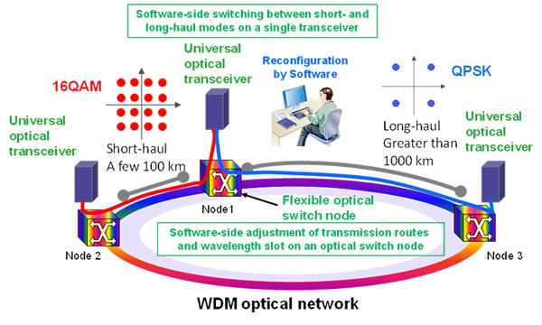 Using digital signal processing technology, Fujitsu developed a "universal transceiver" architecture that makes it possible to make software-side adjustments to the transmission schemes of optical transceivers. To accommodate long-haul users, the nodes can be configured to a relatively wide-band transmission scheme employing a highly noise-tolerant modulation scheme that is suitable for long-haul transmissions. For short-haul users, the nodes can be configured to a transmission scheme that is suitable for short-haul transmissions and features high frequency utilization efficiency, but is not very noise tolerant.
