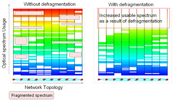 Fujitsu has developed a network control mechanism that employs a defragmentation algorithm for securing usable bandwidth allocable for high-volume data by consolidating fragmented spectrum into an uninterrupted spectrum continuum. Using a flexible optical node device architecture, fragmented optical spectrum resources are continuously consolidated into a wavelength band of a size that is allocable for 400 Gbps-class wide-band signal, all while the network remains in service. By channeling the resulting wavelength band into properly configured optical signals, it is possible to improve the utilization efficiency of spectrum resources.