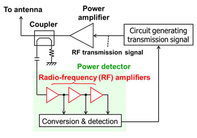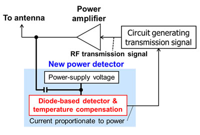 Fujitsu Laboratories has developed a technology that obviates the need for the RF amplifier and applies temperature compensation to diode-based power detection (see Figure 3). Power detection is conducted by generating a current in proportion to the power using a diode.