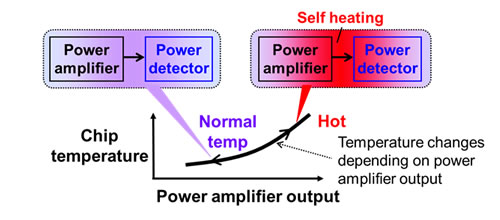 One method for making smaller power detectors uses diodes for rectification, but integration without temperature compensation will result in power detectors with variable characteristics, because the characteristics of diodes change depending on the temperature. Integrating a diode-based power detector with a power amplifier on one chip will be especially susceptible to the chip's own temperature as the power amplifier heats up. In other words, the temperature that the power detector is exposed to will change (see Figure 2). This self-heating varies in response to the output of the power amplifier, meaning the accuracy of power detection will be degraded by the temperature fluctuations.
