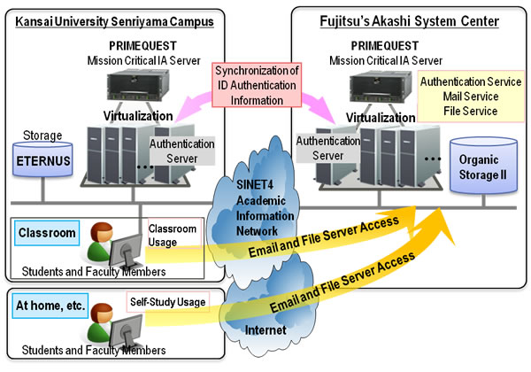 After observing that the actual utilization of servers was far less than initially estimated, Fujitsu employed virtualization technology to reconfigure Kansai University's original array of 21 servers, including those for e-mail and authentication, consolidating them down to just two of its robust PRIMEQUEST 1400S2 Mission Critical IA Servers, which achieve both higher reliability and availability than the previous servers. The two servers are tied together via the university's SINET4(1) academic information network. One handles e-mail and file services for both students and faculty members and is located within the Fujitsu Akashi System Center, which has comprehensive disaster mitigation measures as well as advanced security features. The other server is deployed on campus and replaces the servers managing student, faculty, and staff member information as well as conducting resource management . By adopting the Fujitsu "UnifIDone" integrated ID management system, the authentication systems on both the on-campus server and the one in the Fujitsu Akashi System Center have been synchronized. Now, even if power is down on the on-campus system platform during a power outage, user authentication is still possible through the Akashi System Center. This enables students and faculty members to access e-mail services and browse documents such as teaching materials, reports, and research materials 24 hours a day, 365 days a year.
