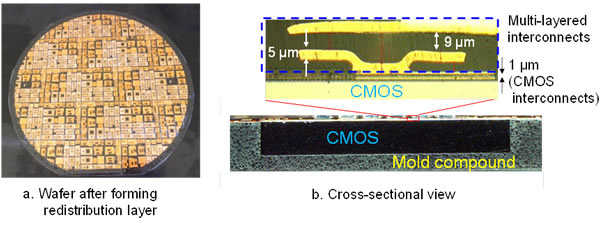 Redistribution layer technology is a packaging technique for semiconductor components in which chip-level semiconductor elements are reconfigured as wafers using a mold compound (Figure 2a) and subsequently formed into a package that connects the electrode patterns between chips through an interconnect process. As the interconnects are formed using a wafer process, fine patterns can be achieved.
