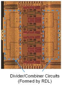 Fujitsu Laboratories has developed a new packaging technology (redistribution layer, or RDL, technology) that combines millimeter-wave high-frequency signals generated by power amplifiers within an off-chip module. This, in turn, has enabled the construction of higher output millimeter-wave power amplifiers.