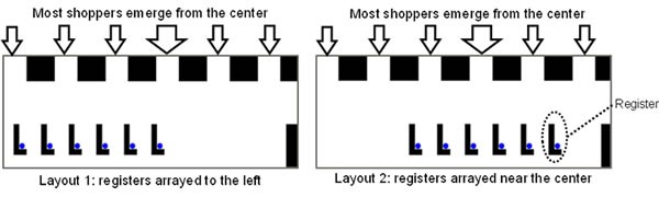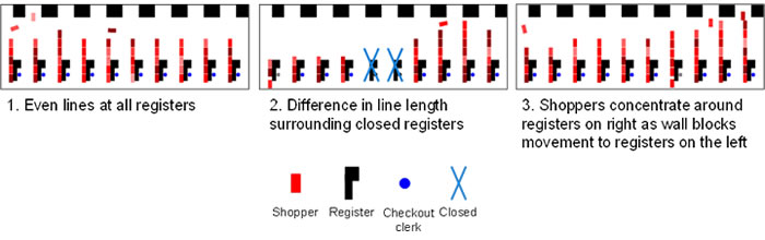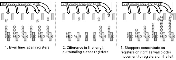 New types of checkout systems have been introduced to reduce staffing costs and increase efficiency during the payment process at cash registers in supermarkets, drugstores, and other retailers. Typically, when studying crowded conditions in stores, queuing theory is used to calculate waiting times, by varying the number of registers and shoppers, but real-world observations of crowding in stores have shown that, depending on time of day, all registers may be equally busy, or some may be empty while others are particularly busy (Figure 1).