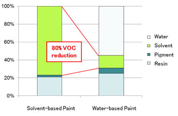 Paints are comprised of several materials: resins, which form a coating with pigments that produce color and luster as the components in the coating; and solvents auxiliary agents, which, as volatile components that do not form part of the coating, are included to thin the materials and help them cover more smoothly. Most of the VOCs in paint are in solvents, so an effective way to reduce use of VOCs would be to switch from a paint that uses solvents to dissolve the resin to a water-based paint that mixes the paint in water.