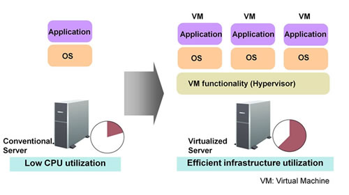 In server virtualization, a single physical server can run multiple VMs simultaneously, with each VM running its own operating system and user programs. This makes use of the continued improvements to server CPUs and makes it possible to reduce equipment costs by consolidating on one server the operations that had previously required multiple servers.
