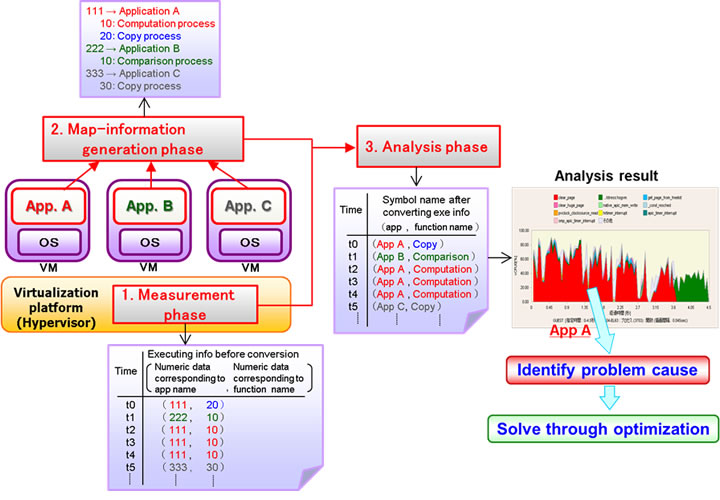 Up until now, when problems arose within a virtual environment, the absence of a tool to analyze the behavior of the virtual environment as a whole made it difficult to identify the root cause of slowdowns at the application or program level. Fujitsu Laboratories has developed a technology that performs overall program behavior analysis by collecting execution information from user programs in each virtual machine (VM) on the virtual platform's hypervisor(1).