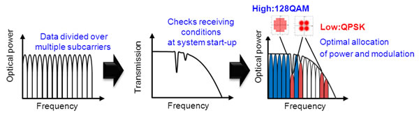 While the DMT modulation/demodulation format is used in xDSL(2), this is the first time it has been used for optical transmissions at 100 Gbps. DMT divides the data into multiple subcarriers (carrier waves), and multi-level modulation is used for each subcarrier to achieve high transmission speeds (Figure 2). To optimize each subcarrier's power and number of multiple values, an algorithm was developed that checks receiving conditions between optical transceivers at the time the system is started up and optimizes power and the number of multiple values to suit the transceivers and line conditions.