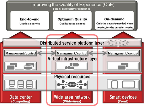 Wide-area network construction involves combining multiple layers, such as broadband optical-transmission, wireless access, and end-to-end packet-communications. The products being announced today are network-virtualization products associated with the packet-communications layer, and are to be steadily rolled out to other wide-area network areas.