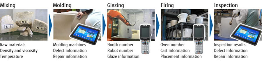 By using the IC tags and barcodes attached to products in progress and all sorts of equipment to collect a variety of performance information, including not only quality and progress information throughout the entire process, from the mixing of raw materials to inspection, but also the humidity and temperature when raw materials are mixed and the type of glaze applied to the sanitary ware, it becomes possible to trace individual products in real time. This enables an understanding of quality information from when the product was manufactured, even after it ships.