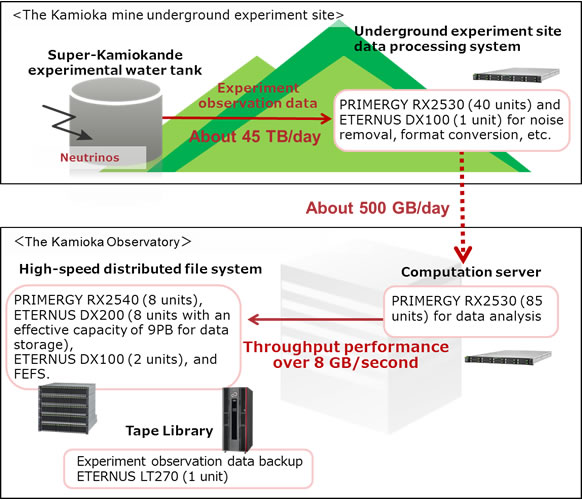 This new system will consist of a computational server cluster that will be composed of 85 FUJITSU Server PRIMERGY RX2530 M2 x86 servers, a high-speed, distributed file system, and a data processing system located at the underground experiment site. The computational server will have a performance level of a SPECint_rate2006 benchmark result of 107,100(2), about triple that of the existing system, with about three times the disk space and data transmission speed.