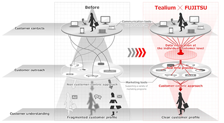 Under the agreement, Fujitsu will deploy Tealium's customer data platform, which enables unified management of an enterprise's large volumes of scattered customer data, and which can link with an array of applications in real time at the individual customer level. Leveraging its expertise in building and operating business systems for different industries, Fujitsu will integrate customers' existing systems with Tealium's platform. In addition, by offering this platform together with Fujitsu's services and solutions that utilize sophisticated data analysis, enterprises can achieve greater granularity in their understanding of customer characteristics, contributing to an optimal approach based on individual customer behavior.