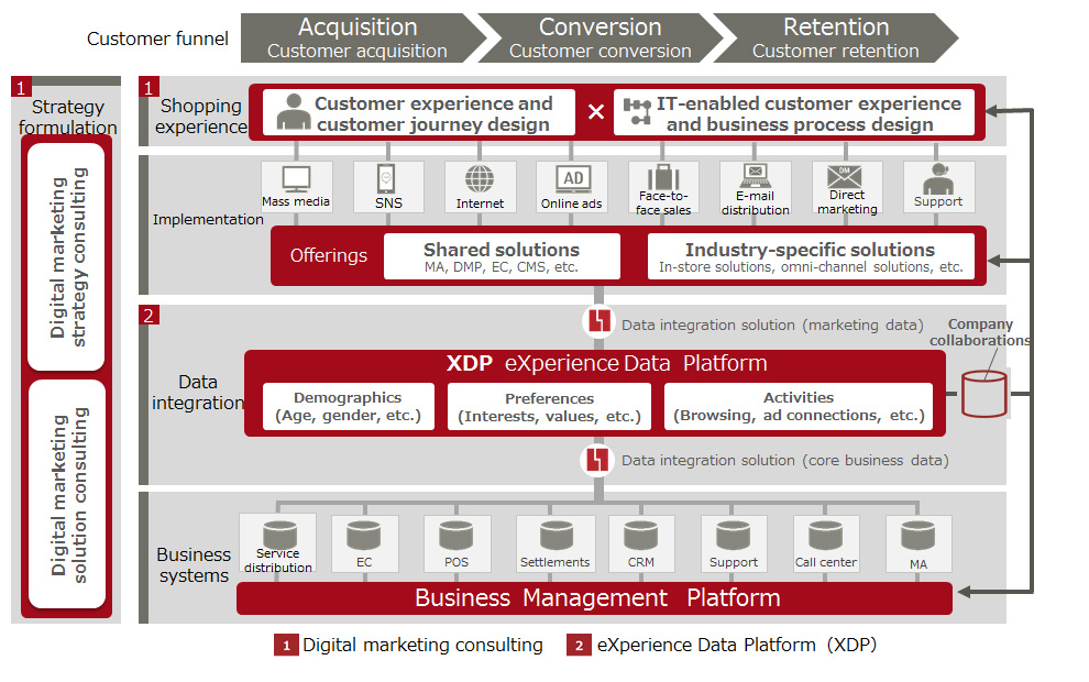 Help for deploying and putting digital marketing to use is provided with a range of options, including data connectors to realize customer-centric data integration, universal data hubs, marketing convergence platforms and other essential components, as well as marketing AI containers that use AI technology, and templates that aggregate expertise.
