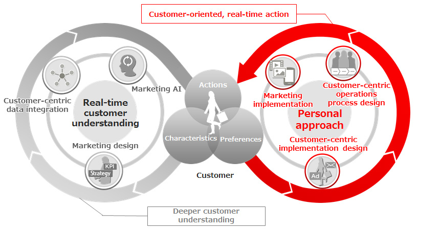 For many companies, different organizations, such as the sales department or the customer-support department, have each been separately approaching customers as part of their operations, creating a situation where there is a lack of a uniform marketing approach across organizations. In addition, because many of the IT products and services used in digital marketing are used for specific tasks, there were issues in getting an all-around understanding of the customer at the level of the individual product, preventing company-wide implementation of optimized marketing.