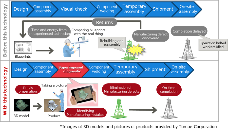 By superimposing 3D blueprints (STL files) over pictures of manufactured components taken with such devices as smartphones or tablets, the user is easily able to find if there are any differences. Because the diagnostic for each component will be completed in a few minutes, it enables diagnoses for all components, which was previously difficult due to time restrictions and other issues. In addition, the system enables early detection of manufacturing defects, eliminating the need to send items back during temporary assembly operations.