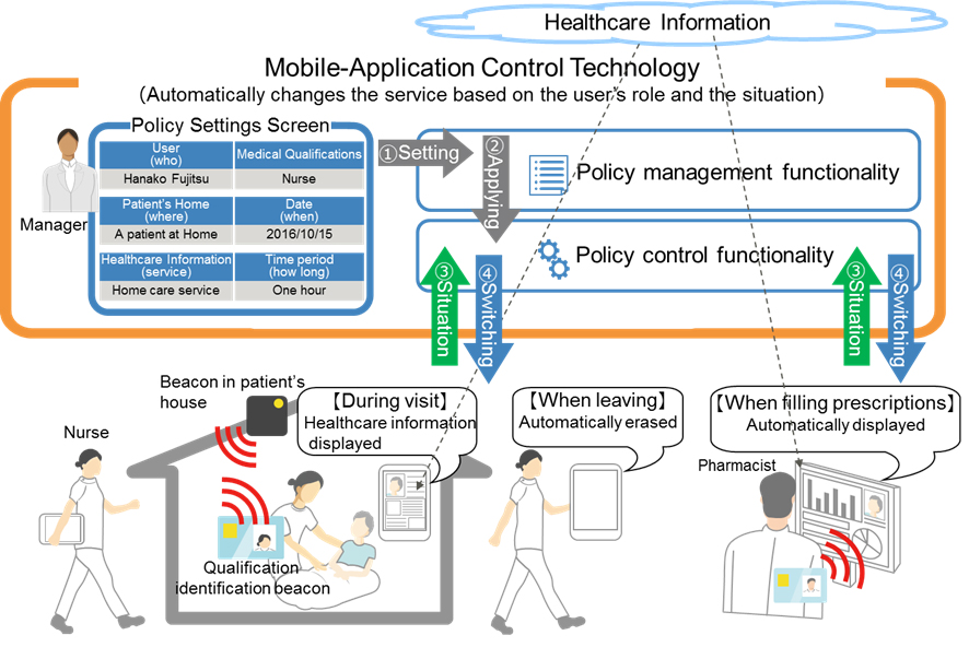 Now Fujitsu Laboratories has developed mobile-application control technology that automatically changes settings, such as whether a patient's medical information is displayed, the limits of sharing, and the applications that can be used. The features of the technology are as follows: