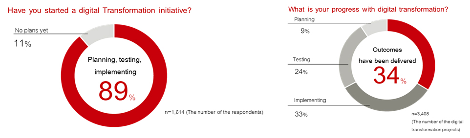 The survey results found that 89% of business leaders confirmed their organizations are undertaking digital transformation initiatives leveraging digital technologies such as artificial intelligence (AI) and the Internet of Things (IoT), and 34% of such initiatives had already delivered positive outcomes. In addition, the survey illuminated the key factors for success in digital transformation, as well as the challenges and necessary capabilities, and perceptions relating to AI.