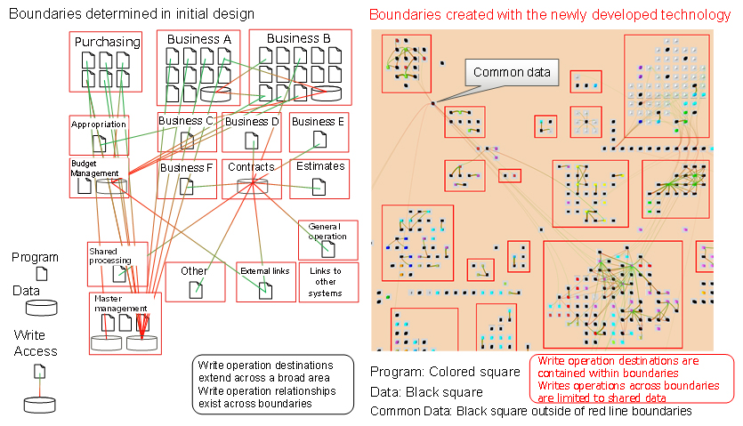 In order to partition a business application into each of its functional components, Fujitsu Laboratories has now developed technology that analyzes the dependencies between programs and data, and then identifies boundary candidates that would partition the program in a way that decreases the mutual dependency. Using access logs to the database when the application is actually run, Fujitsu Laboratories also developed technology that, from among the boundary candidates, finds an area of the program that should be executed as a series of operations, and then finds those areas where the business relationship is highest. By enabling the visualization of the program’s boundaries that partition by function, it is possible to partition applications in cases that this had previously been difficult to achieve.