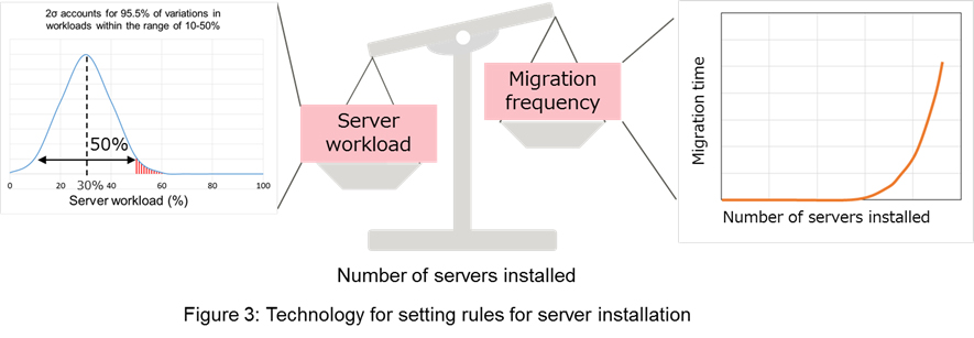 Frequent migrations will occur if server mounting density is increased exceedingly, so an appropriate balance is necessary between migration frequency and server load commensurate with power volume. Fujitsu Laboratories has now developed a technology to determine the number of servers that should be mounted on a rack by statistically estimating the frequency of migrations for each rack, based on the pre-measured load per server, assuming that changes in the load follow the normal distribution (Figure 3). If the center of the normal distribution is a server load of 30%, for example, by installing servers based on a power usage value for 50% load, this would account for 95.5% of changes in load, enabling a maximization of server mounting density.