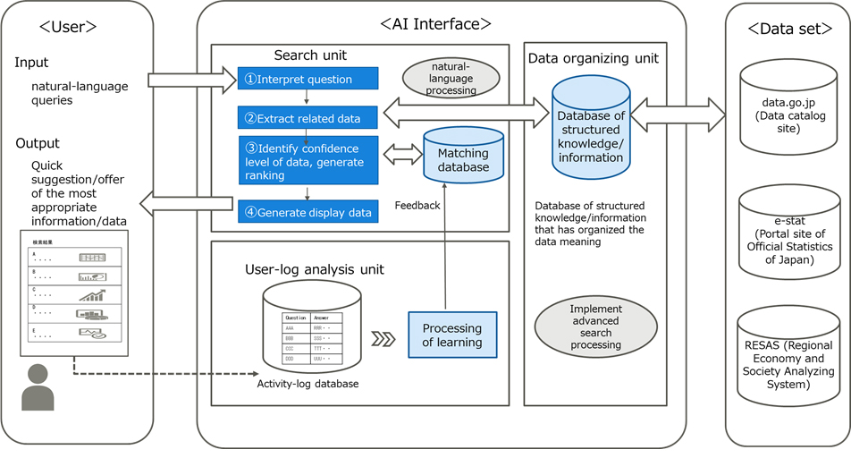 This research will function to develop a test system that can search for required data across three databases including data.go.jp (the national government's data catalog site), e-stat (the Portal site of Official Statistics of Japan), and RESAS (Regional Economy and Society Analyzing System). Accordingly, the system will suggest the most appropriate data. The company will then conduct trials to determine the system's usefulness and investigate its issues, while making a proposal for systemization.