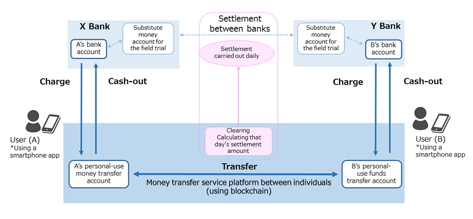 For this field trial, Fujitsu will develop a cloud-based blockchain platform for money transfers between individuals that can be jointly used by these three major banks, as well as a smartphone application that allows users to easily handle the different steps for sending money and for making deposits and withdrawals. Fujitsu and the three major banks will verify that this system can seamlessly link a money transfer account for individuals(1) set up on this platform with the user's actual bank account. The field trial will additionally confirm whether the new platform can accurately and securely handle a series of processes, including transferring value between money transfer accounts for individuals, as well as clearing(2) and settlement(3).