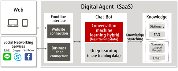 The Digital Agent, offered as a SaaS, is a chat-bot equipped with an interface that can connect to websites and services such as LINE, Skype, and Facebook. It consists of Zinrai, Fujitsu's approach to AI, which automatically recognizes queries, including an individual's fluctuations in vocabulary and synonyms, and it can generate language as well. It also utilizes a company's accumulated FAQs and other data.