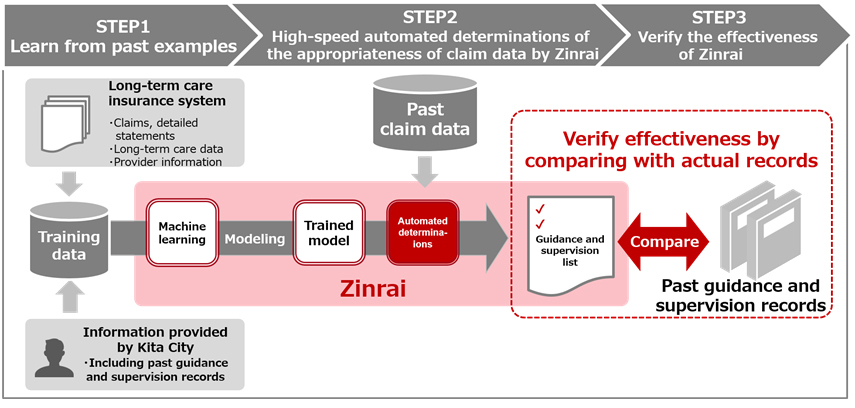 Fujitsu will train machine learning algorithms on data--both appropriate nursing-care benefit claim data and claim data that required guidance and supervision--from past claims by nursing-care service providers stored in Kita City's nursing-care insurance system, and then build a model that can automatically analyze the appropriateness of claim data. Moreover, they will use the newly built model to analyze the appropriateness of nursing-care benefit claim data, and evaluate the results of those analyses against past guidance and supervision records.